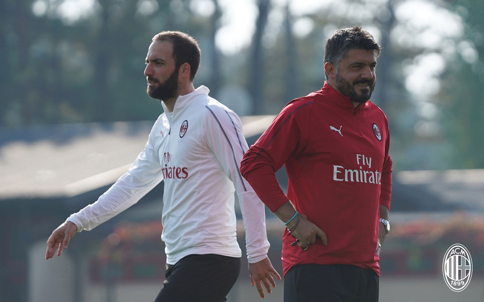 Гонзало Игуаин и Џенаро Гатузо за време на тренинг во Миланело тренинг центарот