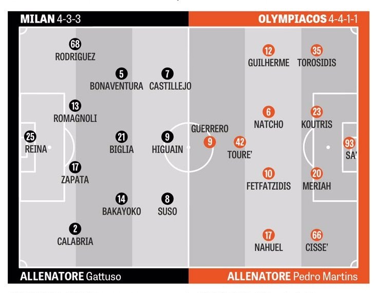 Од таму, за очекување се неколку измени, пред се во средниот ред, каде се очекува да стартува Тиму Бакајоко, на местото на Франк Кеси. Покрај Бакајоко, се очекува средниот ред да го сочинуваат Биглиа и Бонавентура. Во одбраната, се очекува заслужен одмор да добие Мусакио, па останува да видиме кој ќе го завземе неговото место во одбраната. Природно, тоа би требало да биде Матиа Калдара, но новајлијата во тимот на Милан се уште се мачи со повредата и е единствениот играч кој нема да му биде на располагање на Рино за овој натпревар. Повеќе медиуми шпекулираат со името на Запата за таа позиција, па останува да видиме кој ќе биде партнерот на Алесио Ромањоли во одбраната. На бековските позиции се очекуваат веќе стандардните Родригез и Калабрија. Кога станува збор за крилните позиции, медиумите шпекулираат дека по неколкуте добри мечеви и првиот постигнат гол, новајлијата Саму Кастиљехо конечно ќе добие шанса во првиот тим, на местото на Хакан Чалханоглу, додека пак неговиот сонародник Сусо ќе ја завземе својата стандардна позиција на десното крило.