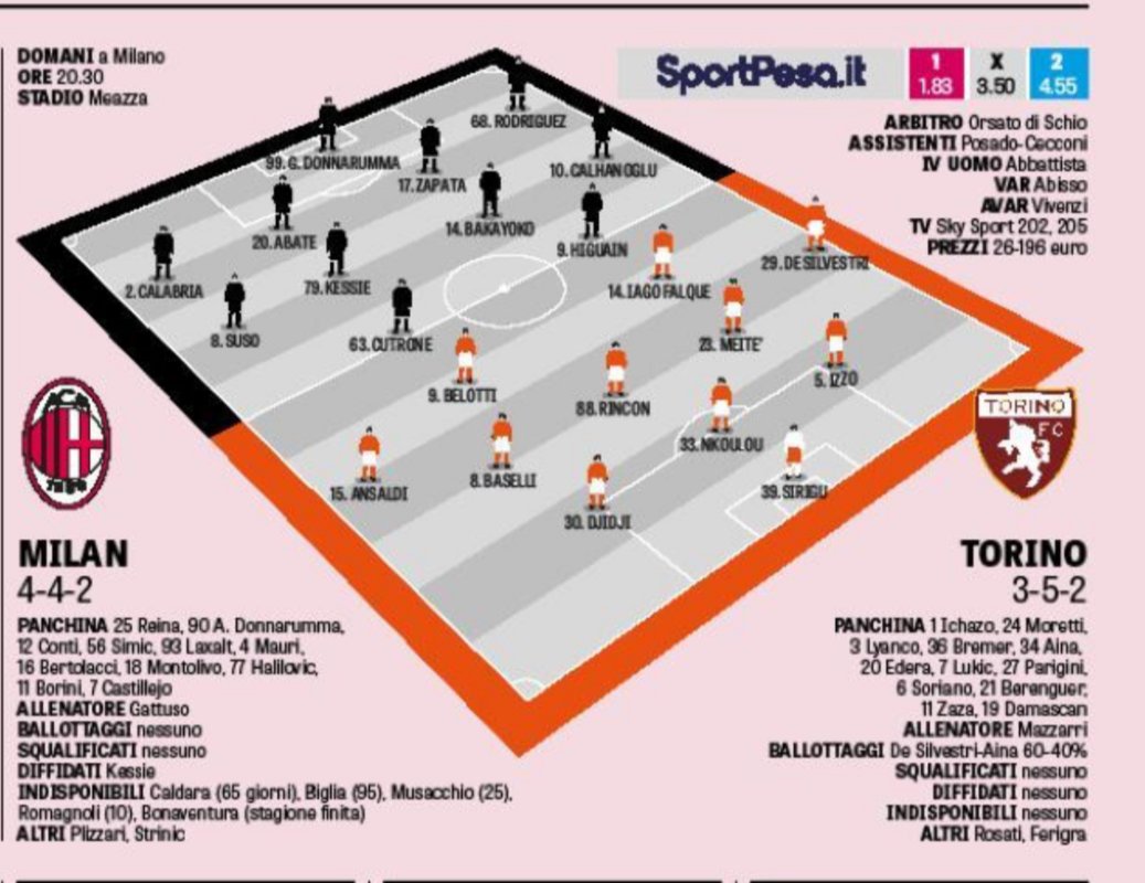 Најголемите проблеми за Милан повторно се во одбраната па покрај Запата и Абате како централни дефанзивци, на бековските позиции ќе настапат Родригез и Калабрија, а своите први минути повторно од клупа ќе ги чека Андреа Конти.