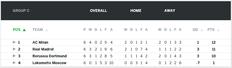 Во втората групна фаза, Милан се најде во групата Ц со Реал Мадрид, Борусија Дортмунд и Локомотив Москва. Речиси идентично како и во претходната фаза, Милан заврши со 4 победи, дома со Реал Мадрид и Локомотив Москва од 1-0 и во гости над Борусија Дортмунд и Локомотив Москва исто со 1-0 и два порази во последните две кола, со Реал Мадрид на Сантијаго Бернабеу од 3-1 и на Сан Сиро минимално од Борусија Дортмунд со 1-0. Повторно Милан заврши на првото место со 12 бодови, оставајќи го зад себе Реал Мадрид кој освои 11.